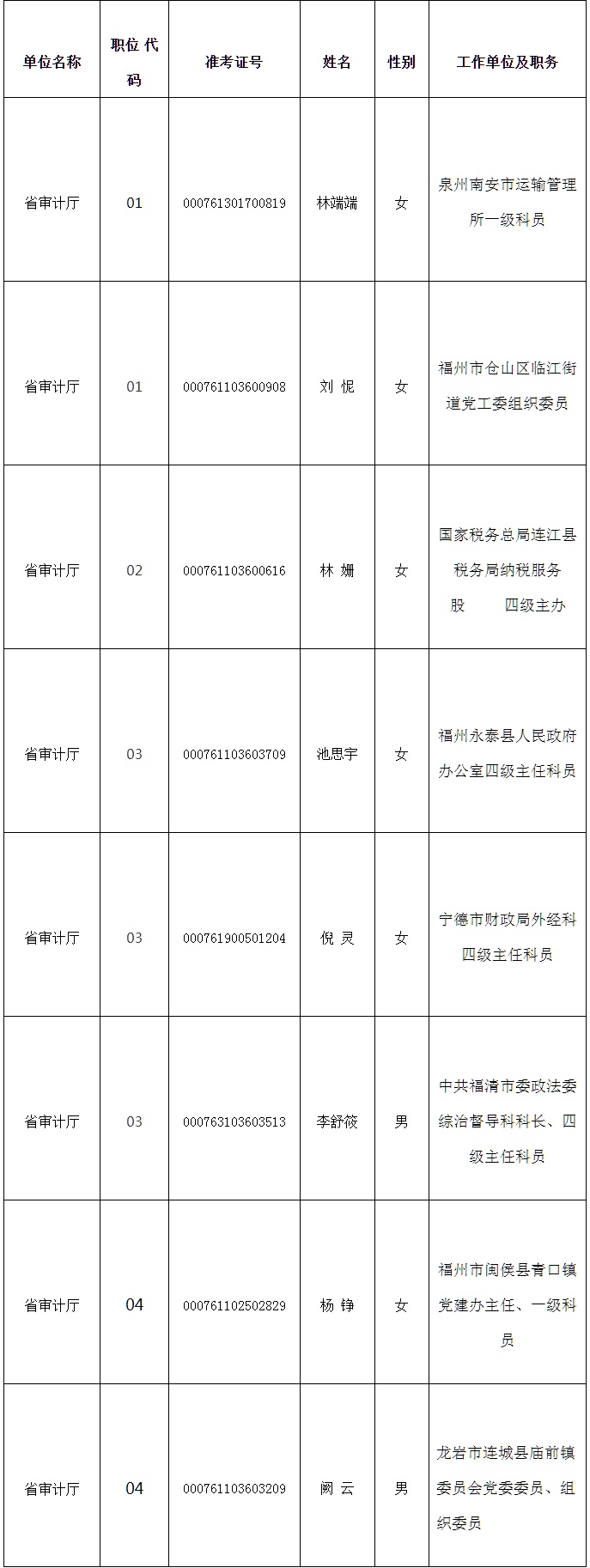 根据《中共福建省委组织部关于印发<2022年度福建省省级机关公开遴选公务员工作实施方案>的通知》(闽委组通〔2022〕20号)精神,经过笔试、面试、考察等程序,本着贴近遴选职位条件要求和人岗相适原则,经福建省审计厅党组研究,确定林端端等8名同志为拟遴选人员,现予以公示。公示时间:2022年11月8日至11月14日(五个工作日,正常工作时间)。公示期间,欢迎群众来电、来信、来访反映情况。
