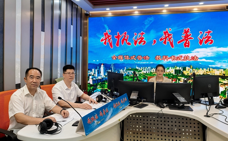 (图为福州市审计局有关同志在电视台直播间宣传法规)